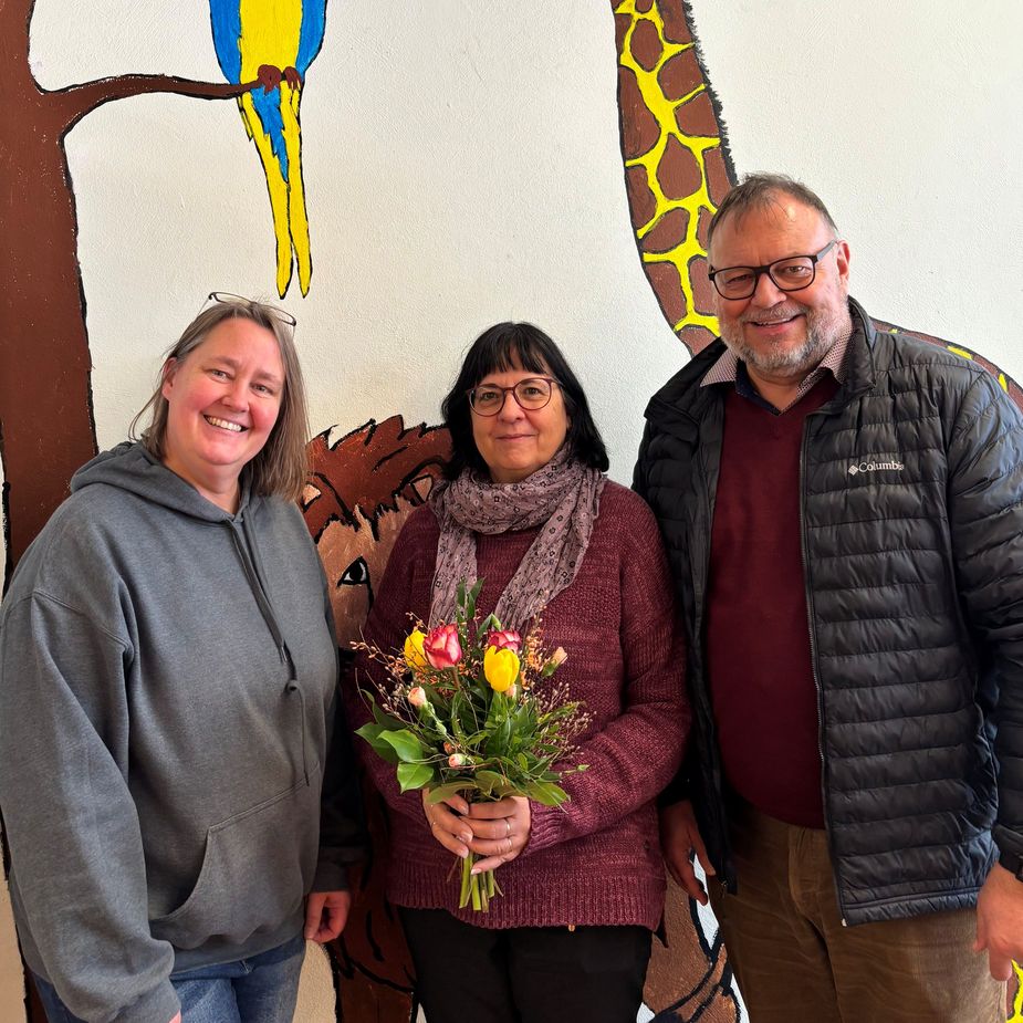 Frau Corinna Weixler (mitte), Mitarbeiterin in der gemeindlichen Schulkinderbetreuung (SKB), konnte vor wenigen Tagen Ihr 10-jähriges Dienstjubiläum feiern.